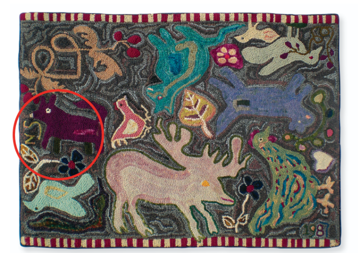 Animal Melange, 42″ x 32″, #4 and 8-cut wool and eyelet strips on linen. Designed and hooked by Nancy Smith, Roca, Nebraska, 1987. See the small animal circled near my initials? This rug illustrates how I took a creature from a previously hooked large rug and used it for the subject of a small pattern.