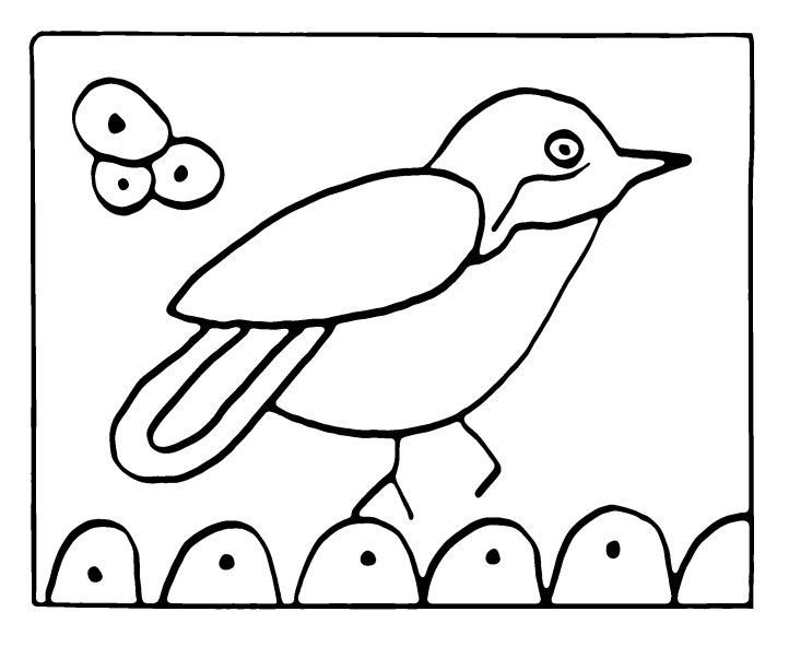 Now outline the various body parts: the head, the wing, the tail feathers, and the breast. All these shapes have curved outlines. Work from the inside of the curved lines because this compacts the hooked loops better than working from the outside. Remember the direction of your bird’s feathers. The breast should be gently curved as well. Think of the direction of the tail feathers and the feathers in the wing. Keep the natural positioning of the feathers in mind as you fill in the various body parts, too. For instance, the tail feathers’ outline is curved, but the curve is actually an optical illusion created by a number of straight feathers that form the look of a curved tail. Hence, while the outline is curved, the interior lines (feathers) are hooked in straight lines as they truly are on the bird’s body. Do not just fill in willy-nilly.