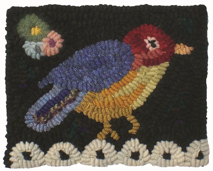 Eyelet Bird, 6 1/2″ x 5 1/4″, #8-cut wool on linen. Designed and hooked by Nancy Smith, Roca, Nebraska, 2010.
