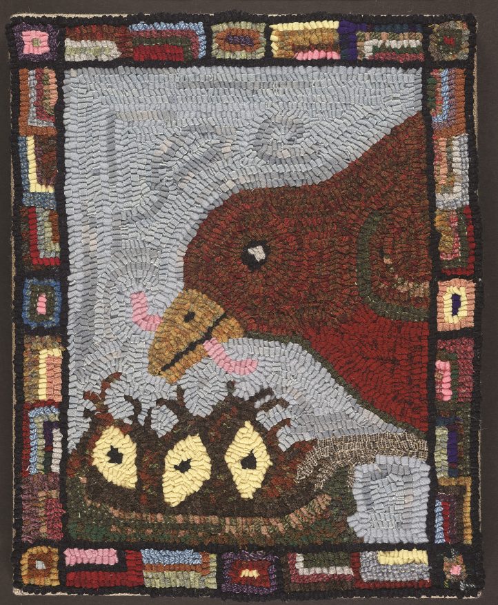 The babies are represented by their huge, gaping beaks. I added a colorful border to create more visual interest—it’s a perfect way to use up some of your “worms,” those extra strips of wool leftover from the rugs we hook. (As hard as I try to not cut too much wool, I seem to add to my mountain of worms with each project.)