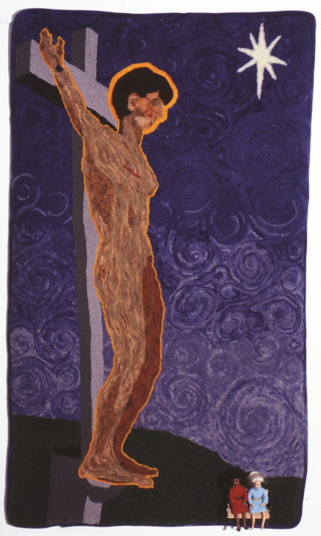 The Christa, 50″ x 30″, #4-and 6-cut wool, plastic dolls, and park bench on linen. Designed and hooked by Emily Robertson, Cambridge, Massachusetts, 2006.