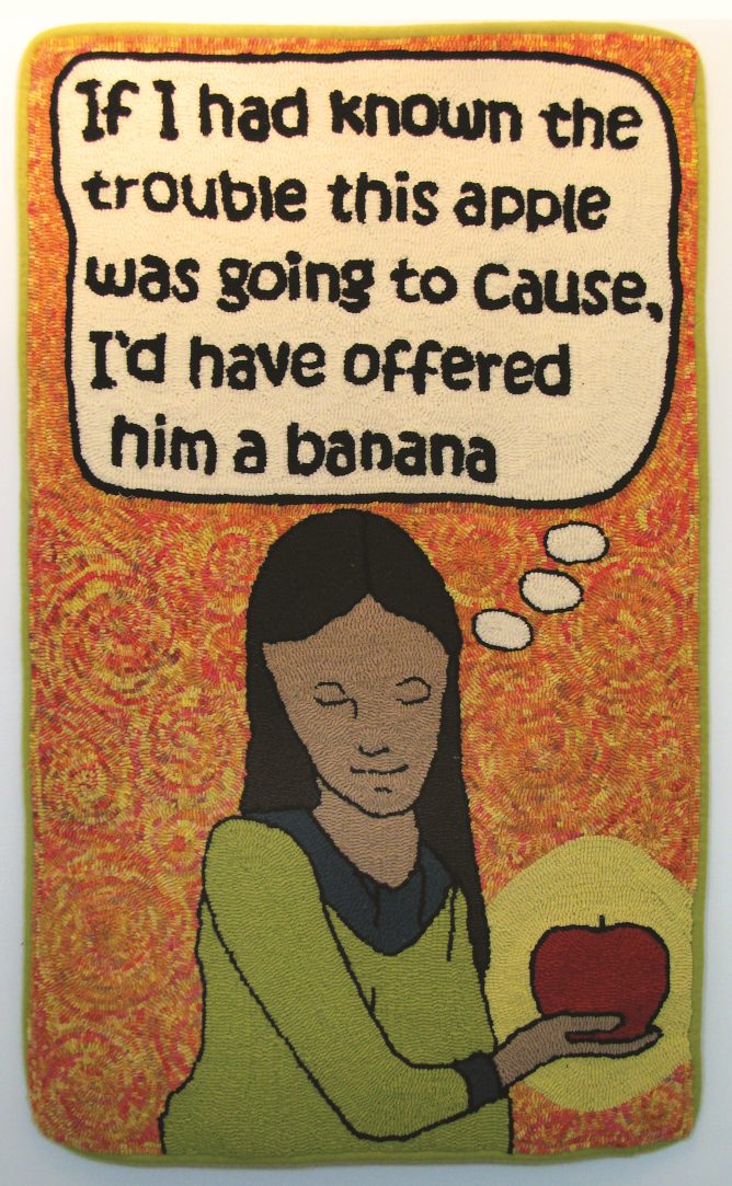 Eve, 44″ x 27″, #4- and 6-cut wool on linen. Designed and hooked by Emily Robertson, Cambridge, Massachusetts, 2008.
