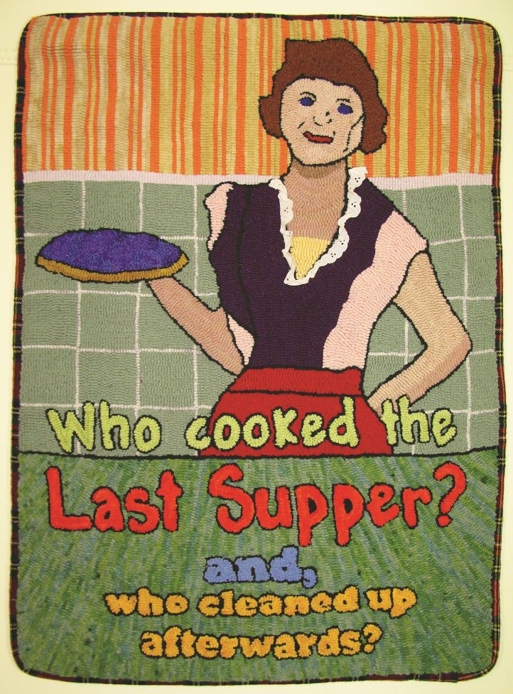 Who Cooked the Last Supper?, 36″ x 26″, #4-and 6-cut wool and cotton lace on linen. Designed and hooked by Emily Robertson, Cambridge, Massachusetts, 2006.