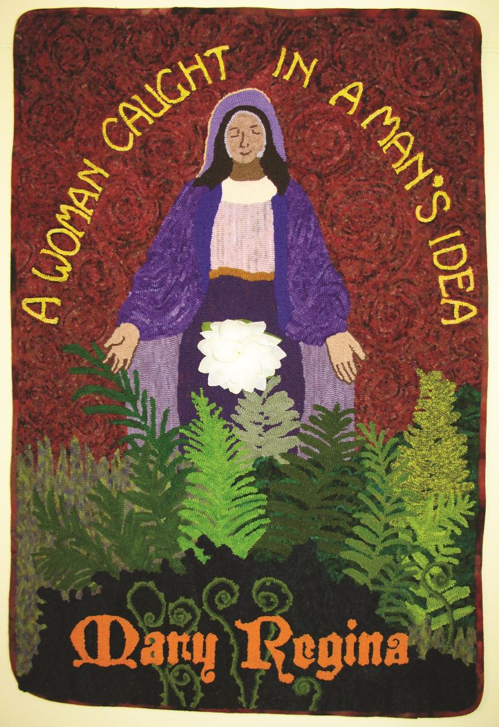 Mary Regina is represented in her most traditional pose. I used a statue outside of our local Catholic church for inspiration. I have strong feelings about the role women have traditionally held throughout the history of Christianity, and I conveyed them in both the words of this rug and its imagery. Mary is standing among ferns to convey her earthiness, and an artificial lotus blossom located at her pelvis conveys the pureness and perfection of her role in history. The background is a deep red spot-dyed wool to remind the viewer of blood, of the effort of bringing forth life, and of the glorious passion needed to sustain it.