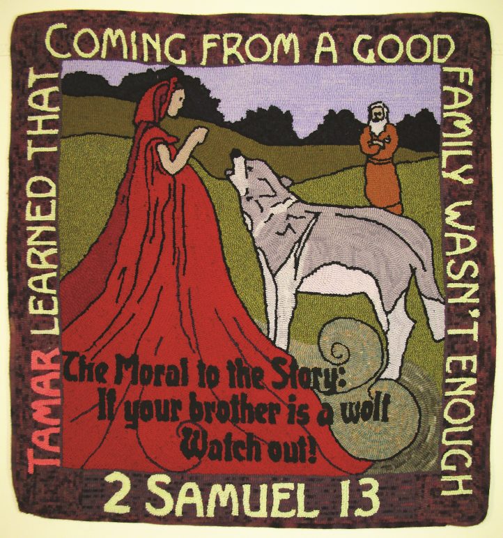 Second Samuel: 13, 33″ x 36″, #4-and 6-cut wool on linen. Designed and hooked by Emily Robertson, Cambridge, Massachusetts, 2007.