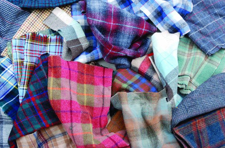 Laurie used this pile of plaids to create the 30 circles and 30 squares in her design. The only plain piece of wool in the rug was used to hook the border.
