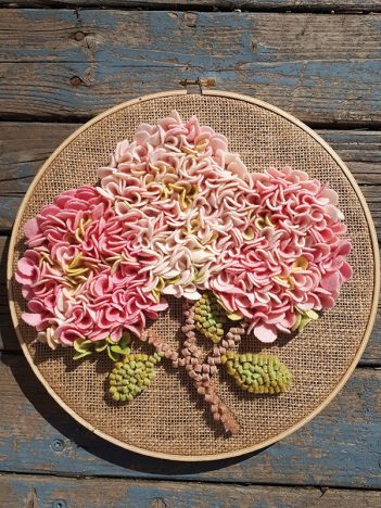 Whether you’re new to proddy or already a fan, this project is a delight. Created originally as a workshop piece, this hoop art project makes hydrangeas achievable and stunning. With carefully dyed wool in shades of purples, pinks, and blues, you’ll trim small squares into soft, rounded petals and hook them into a full, dimensional bloom that seems to pop right off the fabric.