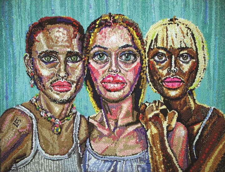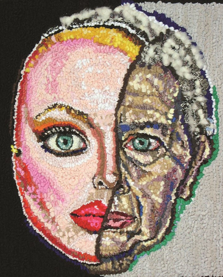 Sustenance from Strangers (Self-Portrait), 36″ x 33″, various cuts of discarded clothing on cotton rug warp. Designed and hooked by Linda Friedman Schmidt, 2010.
