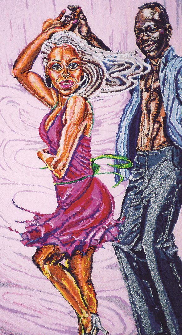 . . . has helped me connect with others. Clothing tells a real-life story, evokes deep feelings, and captures personal experiences. The recycled clothing I use in my work does all that as well and links me to others whose garments wear on in my work. I thread one generation to the next, connecting with my mother and all the women who picked up hooks and needles before me. I most often bond with others nonverbally through eye contact and touch on the ballroom dance floor. Maybe this is why viewers comment on the eyes and hands when looking at my artwork.