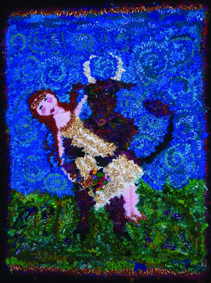 Spring Nuptials: Taurus Takes a Wife, 18″ x 26″, hand-cut sari silks, silk yarn, nylon stockings, and metallic material on rug warp. Designed and hooked by Patti-Lynne Armstrong, South Zurich, Ontario, Canada, 2011.
