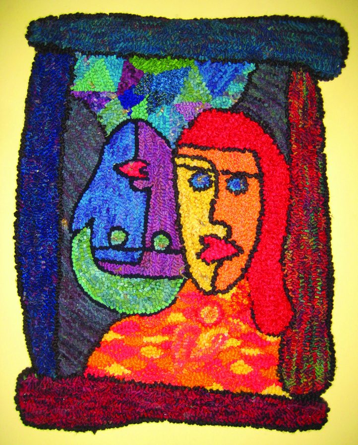Appropriately titled, the design has a dreamy feeling reminiscent of a Chagall painting depicting a wedding with a goat playing the violin. Patti is allergic to wool yet fell in love with pulling loops through a backing to make rugs and art several years ago. She earned a teacher’s certificate through the Ontario Hooking Craft Guild using alternative materials for all the skills. The sari silks were difficult to pull through and form loops due to the wider hand cuts, but the shimmer of silk and the jewel colors made the effort worthwhile. The silk yarn was easier to manipulate, pulling through very smoothly and adding a whimsical, free feeling to the grass and whipped edge. The bull is hooked using the smooth silk, too. Copper metallic material complements the blue sky (orange and blue are complementary colors, or opposites, on the color wheel).