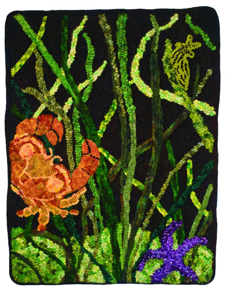 A trained marine ecologist, Diane translated her sign using the local sea creatures of the Pacific Northwest. Dungeness crab, eel grass, a blue starfish, and sea slug all happily coexist underwater amidst the flowing grasses. The crab is Cancer’s symbol. Diane used yarns to soften the ground, and a harsh ribbon makes the surface of the starfish quite realistic. Diane and her family spend extended vacations on the waterways between Seattle and Alaska, and her hooking portrays calmness on the sea floor not often seen from above.