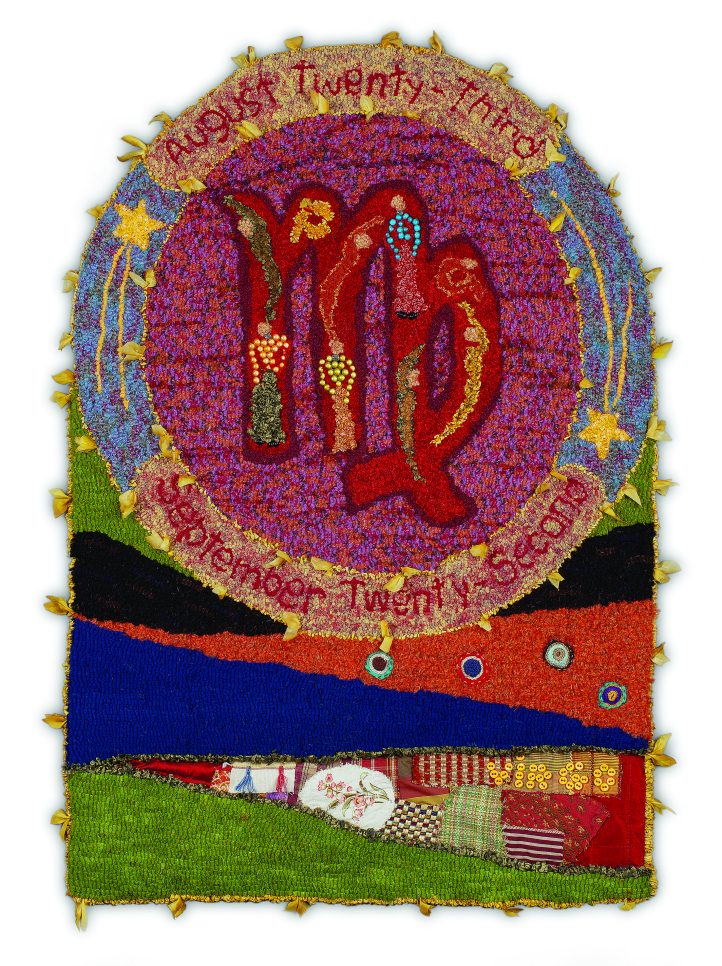 Virgo, 18″ x 26″, #5- and 6-cut wool, yarn, beads, fabric, and buttons on linen. Designed and hooked by Francine Even, Norwalk, Connecticut, 2011.