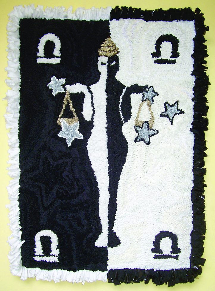 In preparing to create her design, Yvonne researched Libra and discovered that scales and balance were prominent. She divided the work in half vertically, composing a body holding scales with the constellation in the background. Using a stark palette of white and black posed practical problems: the white sweatshirt fabric picked up black fluff if hooked first. She changed to a stretchy lacy underwear material, which resisted the fuzz. The small details were difficult to hook in recognizable form and were redone several times using different widths and materials. Note that the Libra symbols are the same sizes in white and black, yet the white ones seem larger because of the white’s intensity against the black. In the background of both she hooked a larger star; it is most visible on the black side. The edge is prodded with 3″ knitted material and plastic bags to soften the harsh design elements.
