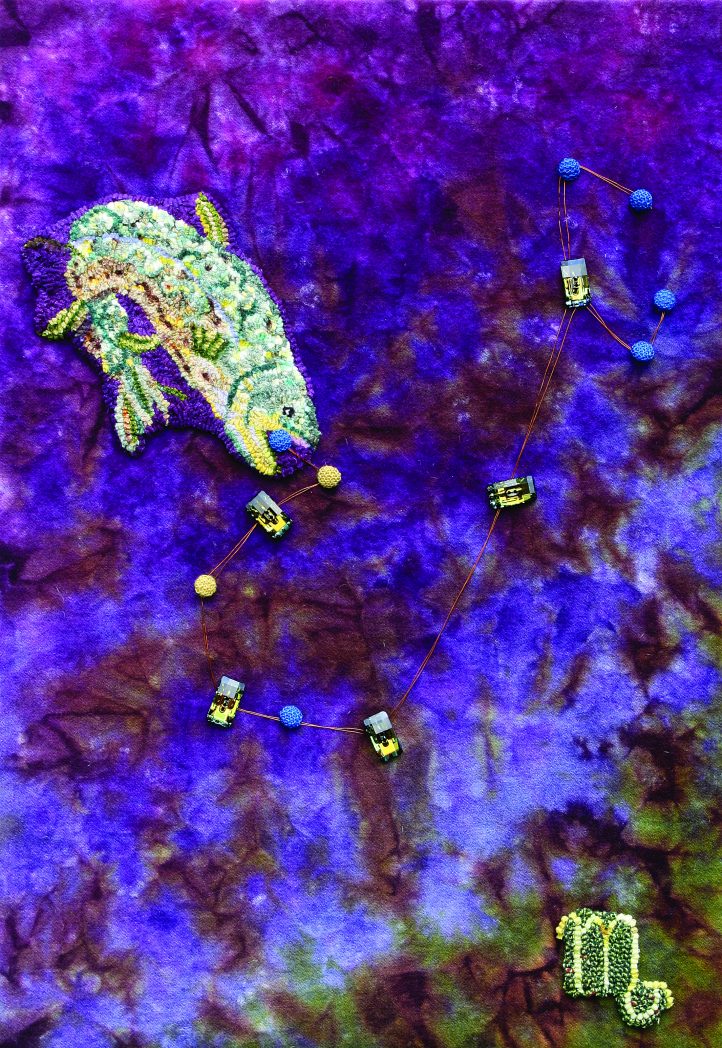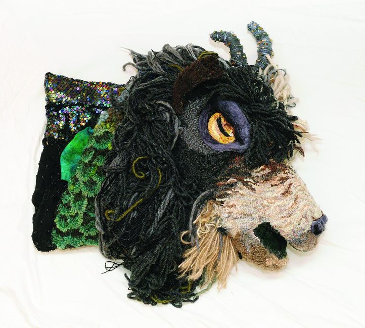 Capricorn, 18″ x 26″, wire, roving, wool fabric, yarns, crystals, embroidery floss, and recycled sequined dress on linen backing. Designed and hooked by Natasha Chan, Carmel, Indiana, 2011.