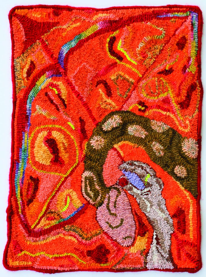 Gemini, 18″ x 26″, yarn, #5- and 6-cut wool, and other materials on monk’s cloth, mounted on matte board. Designed and hooked by Sara Judith, Nelson, British Columbia, Canada, 2011.