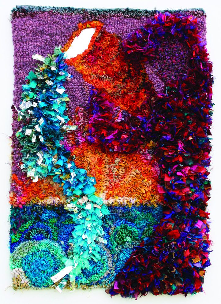Aquarius, 18″ x 26″, silk sari ribbons, mirror, Mylar, and yarn on monk’s cloth. Designed and hooked by Jo Franco, Perth, West Australia, Australia, 2011.