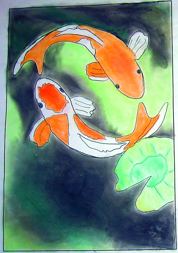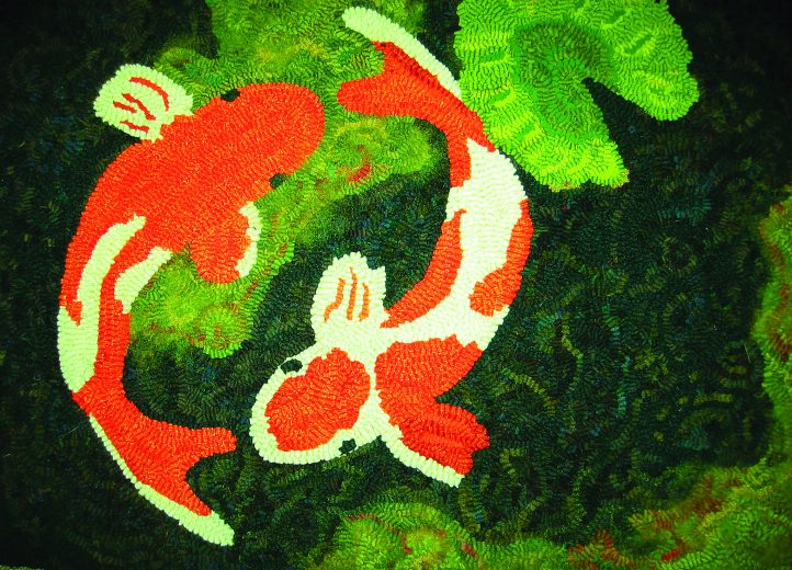 The colored pencil sketch shows Andrea’s initial design. The position of the two fish swimming in opposite directions symbolizes the internal struggle of the soul. They form a circle representing life after death (or from the struggle). Her image can be viewed from any angle, and without a definite border, the viewer seems to be looking down into the pond. A murky, dark water with layers of fish below the two prominent ones and water lily pads as quiet places called for hand-dyed wools. Since the design had been sketched—and color planned—prior to hooking, Andrea knew it well. Small details such as the dorsal fins and scales were eliminated to portray the ethereal simplicity of the subject.